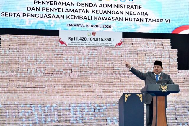 Nusantara Satu-Presiden Prabowo Subianto menyaksikan penyerahan denda administratif dan penyelamatan keuangan negara, serta penguasaan kembali kawasan hutan tahap VI, di Kompleks Kejaksaan Agung RI, Jakarta, Jumat (10/04/2026).